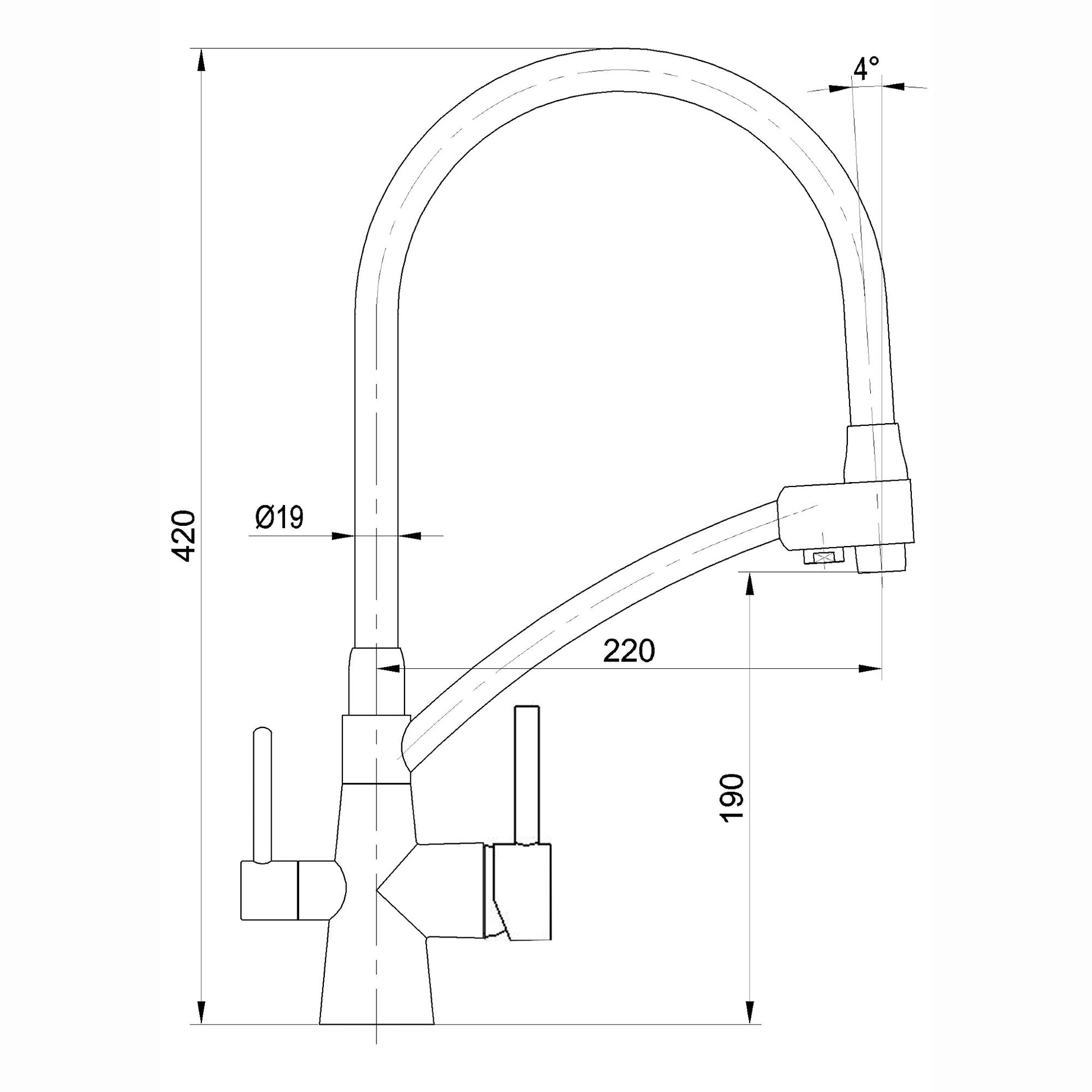 - SIZE - Height - approximately 420mm. Spout projection - approximately 220mm. Sink tap hole diameter required - approximately 35mm. Suitable for worktops and sinks up to 40mm thick.
