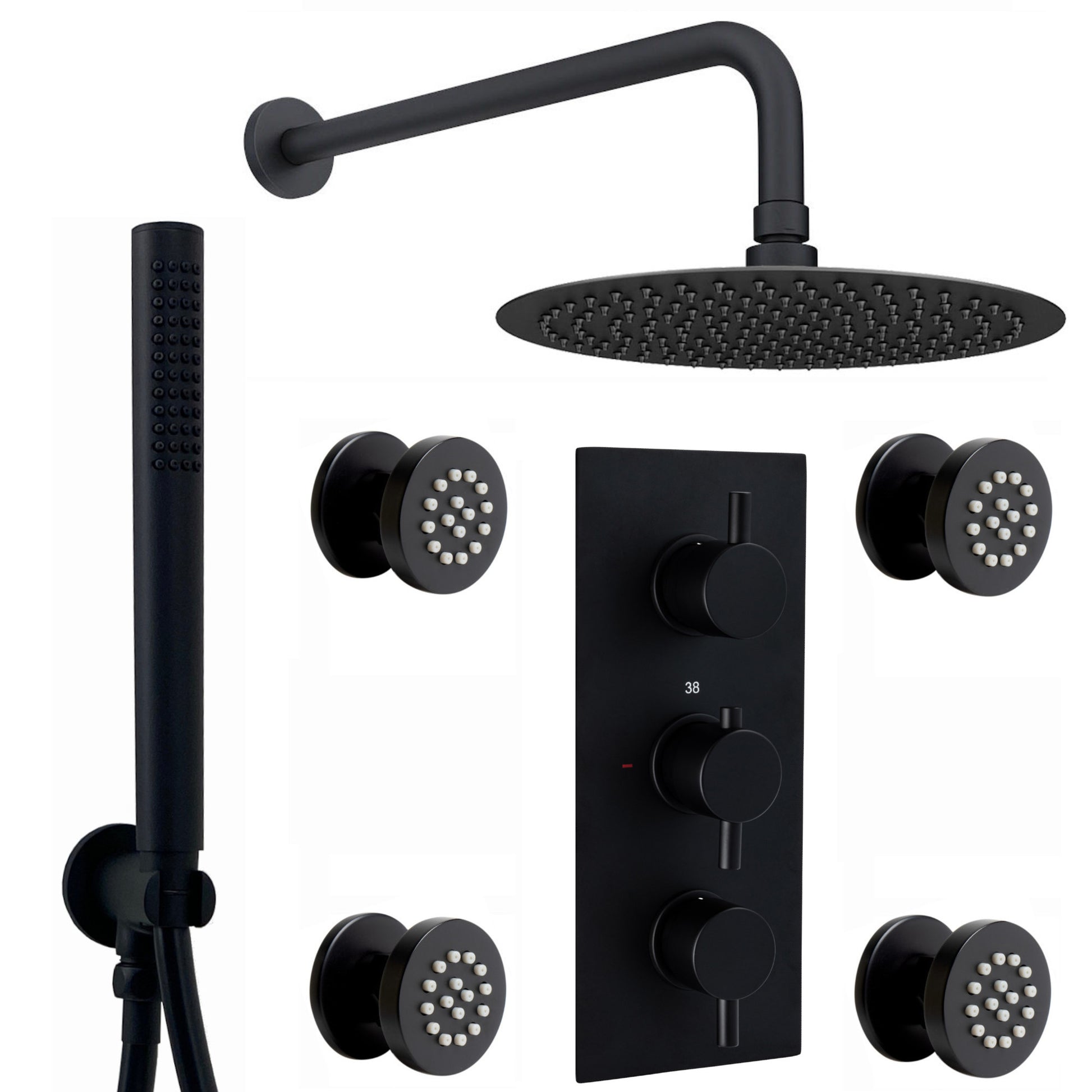 Naples Contemporary Round Concealed Thermostatic Shower Set Incl. Triple Diverter Valve, Wall Fixed 8" Shower Head, Handshower Kit, 4 Body Jets - Black (3 Outlet)