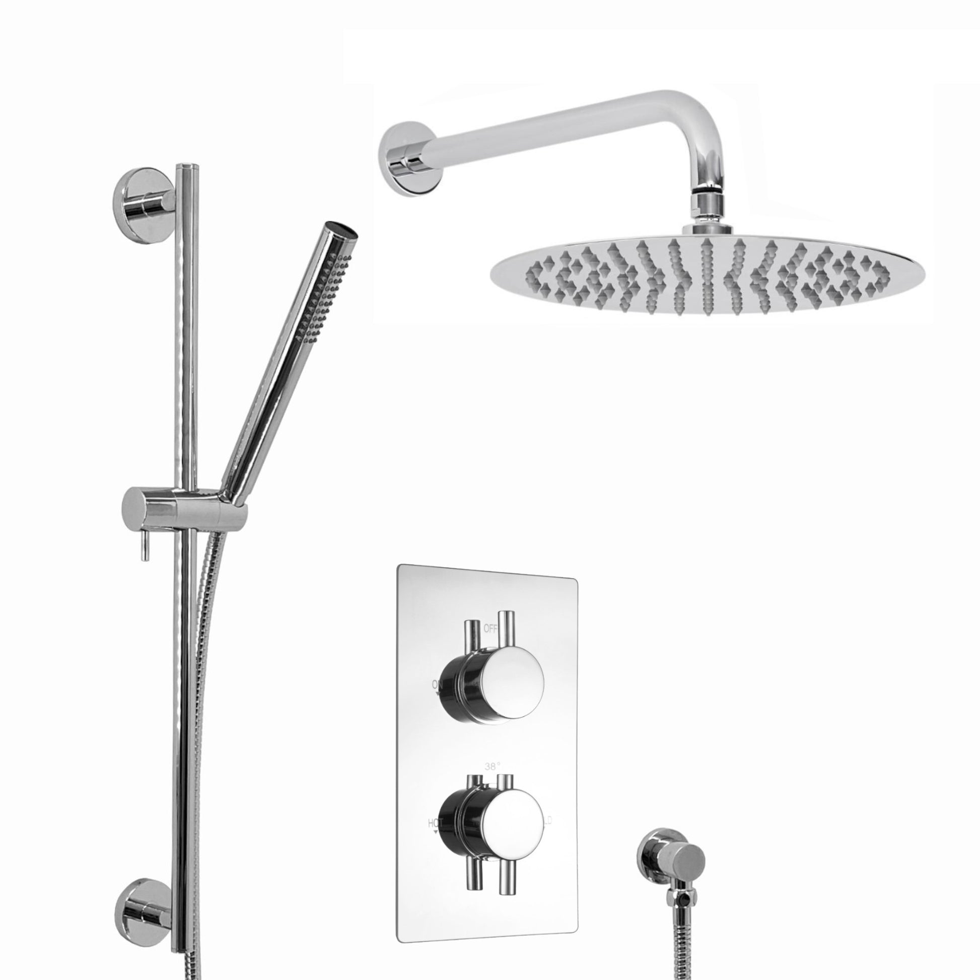 - Set includes: concealed thermostatic shower valve, wall-mount shower arm, 8" shower head, slider rail kit