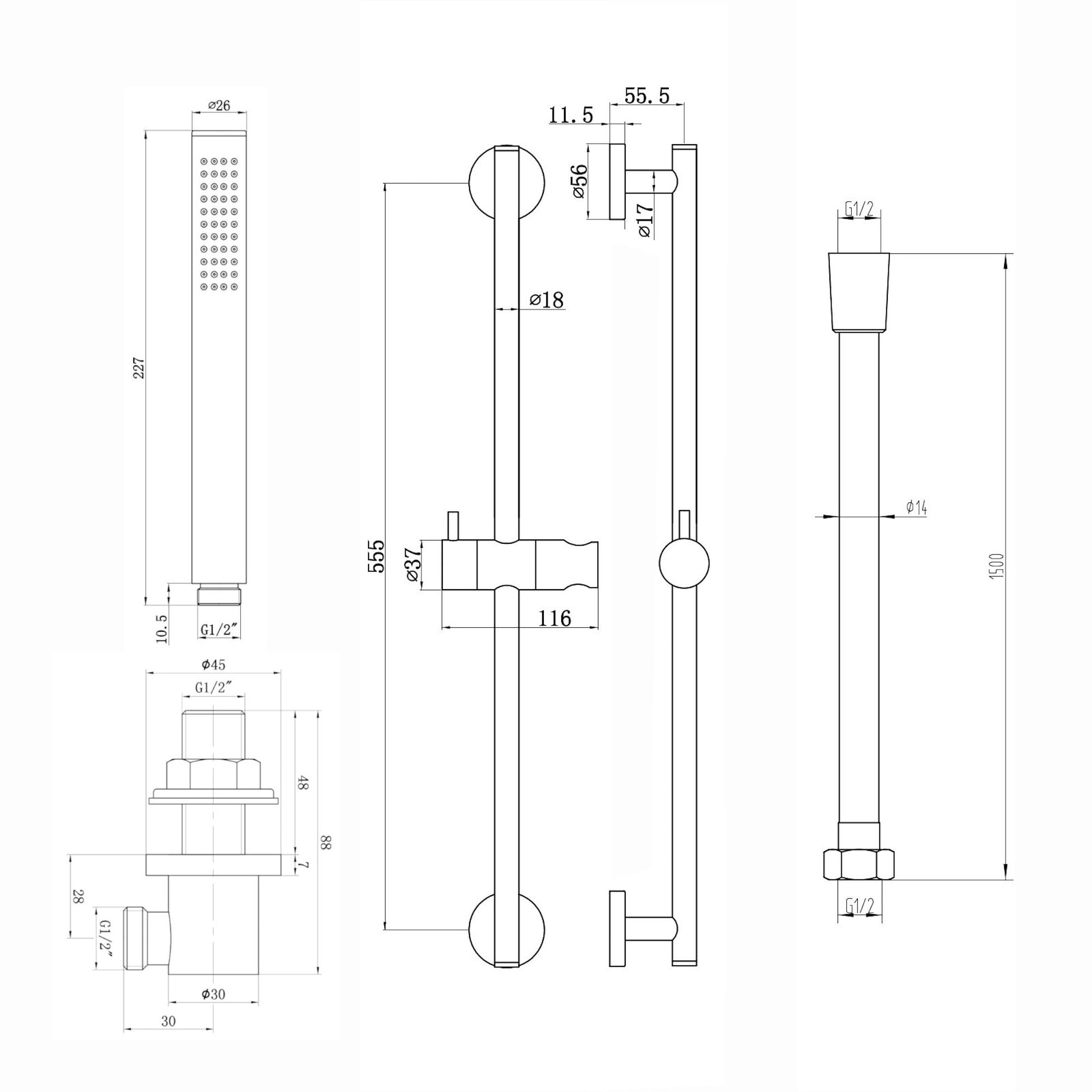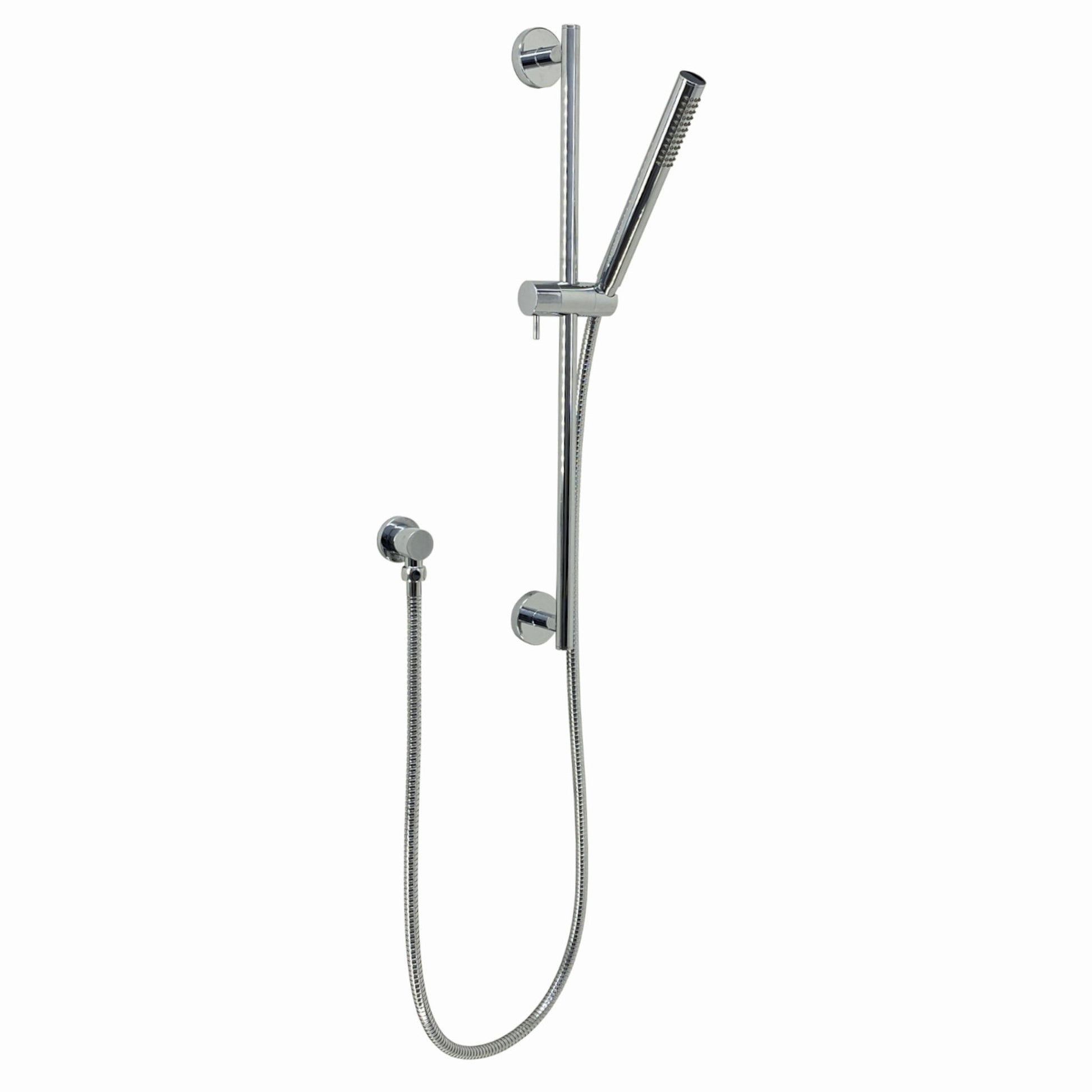 - Handheld shower head, hose, wall outlet, slider rail