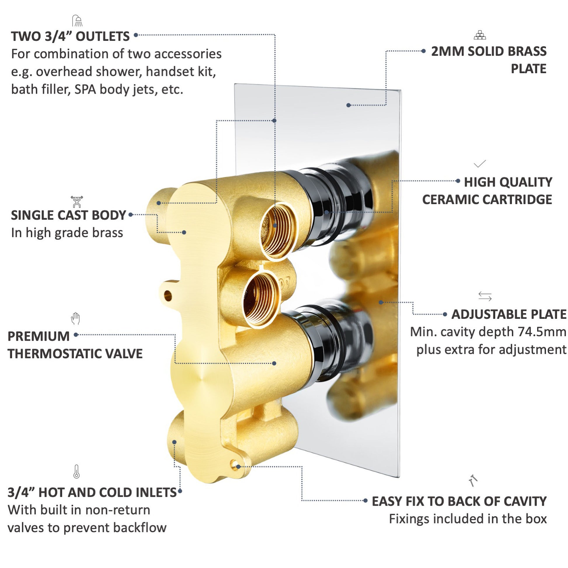 - 3/4" hot/cold inlets with built-in non-return valves to prevent backflow